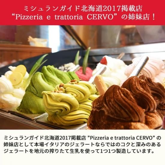 ミシュランガイド北海道2017掲載店「Pizzaeria e trattoria CERVO」ピッツェリア エ トラットリア チェルボの姉妹店として本場イタリアのジェラートならではのコクと深みのあるジェラートを地元のしぼりたて生乳を使って1つ1つ製造しています。